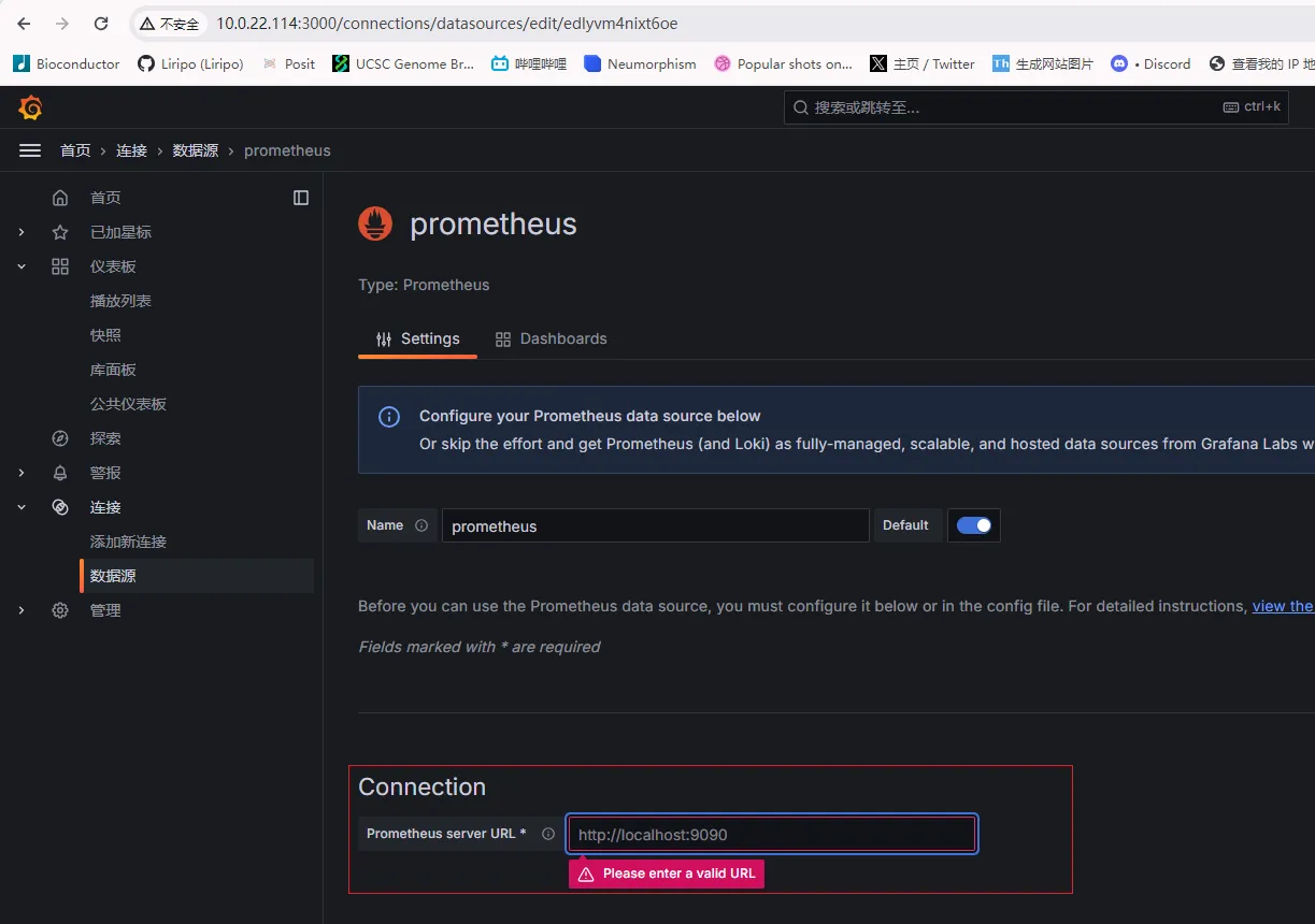 - 添加 prometheus数据源,在下图红框位置填写prometheus地址即可